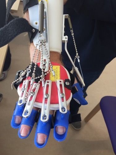 SaeboFlex and SaeboGlove. One of my OTs said that I might be a good candidate to get one so he proceeded to arrange it. By the end of August 2017, I was having the SaeboFlex adjusted to fit. I tried the SaeboGlove in October but my it wasn’t suitable for my needs. The idea behind the SaeboFlex is to build strength in the fingers, using springs as a form of resistance. For my use it was a case of building strength and trying to get my thumb involved by positioning it accordingly, allowing me to pinch forefinger and thumb together. But, unfortunately, there is atrophy in my right hand between my thumb and forefinger that seemingly prevents the pinching movement, and I’m unable to build up the first dorsal interosseous muscle that controls this move. The exercise to build up this muscle involves moving the index finder side-to-side, preferably with resistance such as a rubber band placed over all the fingers, but no finger on my right hand moves side-to-side. It seems that my brain is obviously not sending necessary messages to the required muscles in my hand. Upon my handing back the mitts in October 2018, I was told that I should return to physio if I felt the need to.
