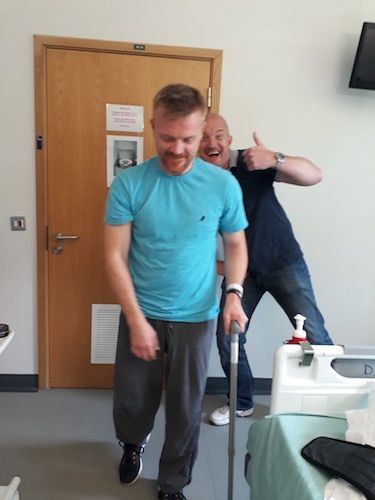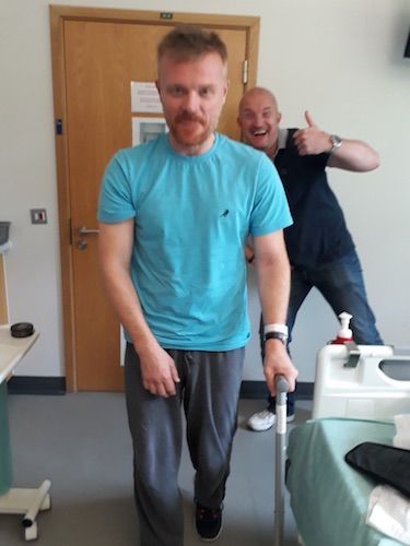 I have got only two photos of my time in hospital. They were taken by Abi and show my brother watching my walking with a stick. My right arm is a dead weight in the photos, completely lifeless, impotent, paralysed. Truly flaccid. I started walking with a stick on Thursday 18th, the photos were taken on Friday 19th, I left the hospital on Thursday 25th.